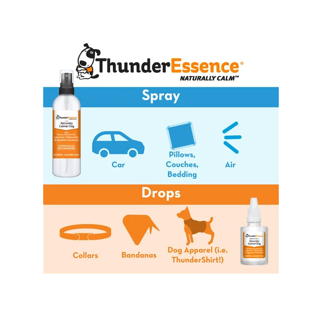 Need help deciding between the drops vs. the spray? The drops are more concentrated, and the spray tends to spread out to cover larger areas. If you are planning to apply ThunderEssence onto something that will go directly on your dog, you should purchase the drops. If you are wanting to apply ThunderEssence in an area, you should use the spray. Both can be effective in calming your dog.