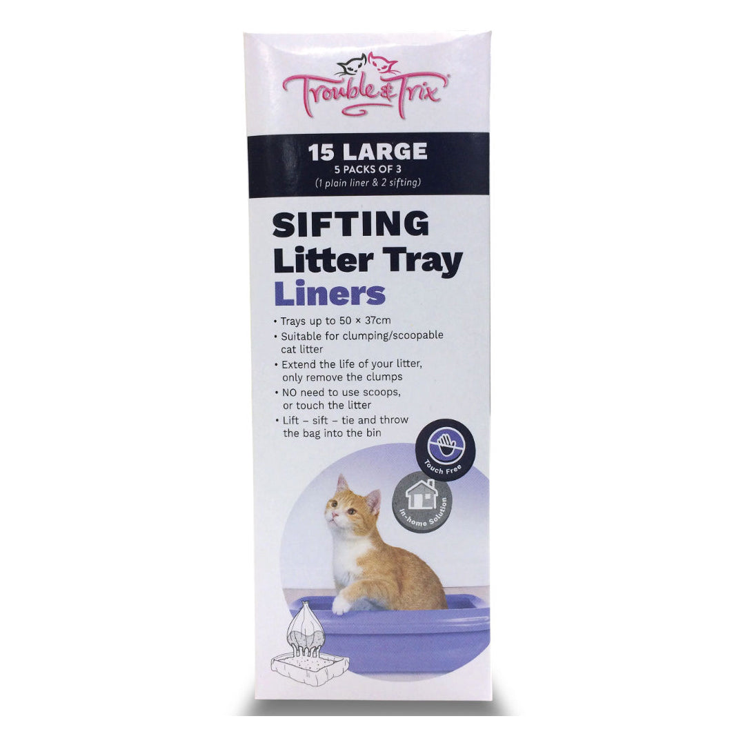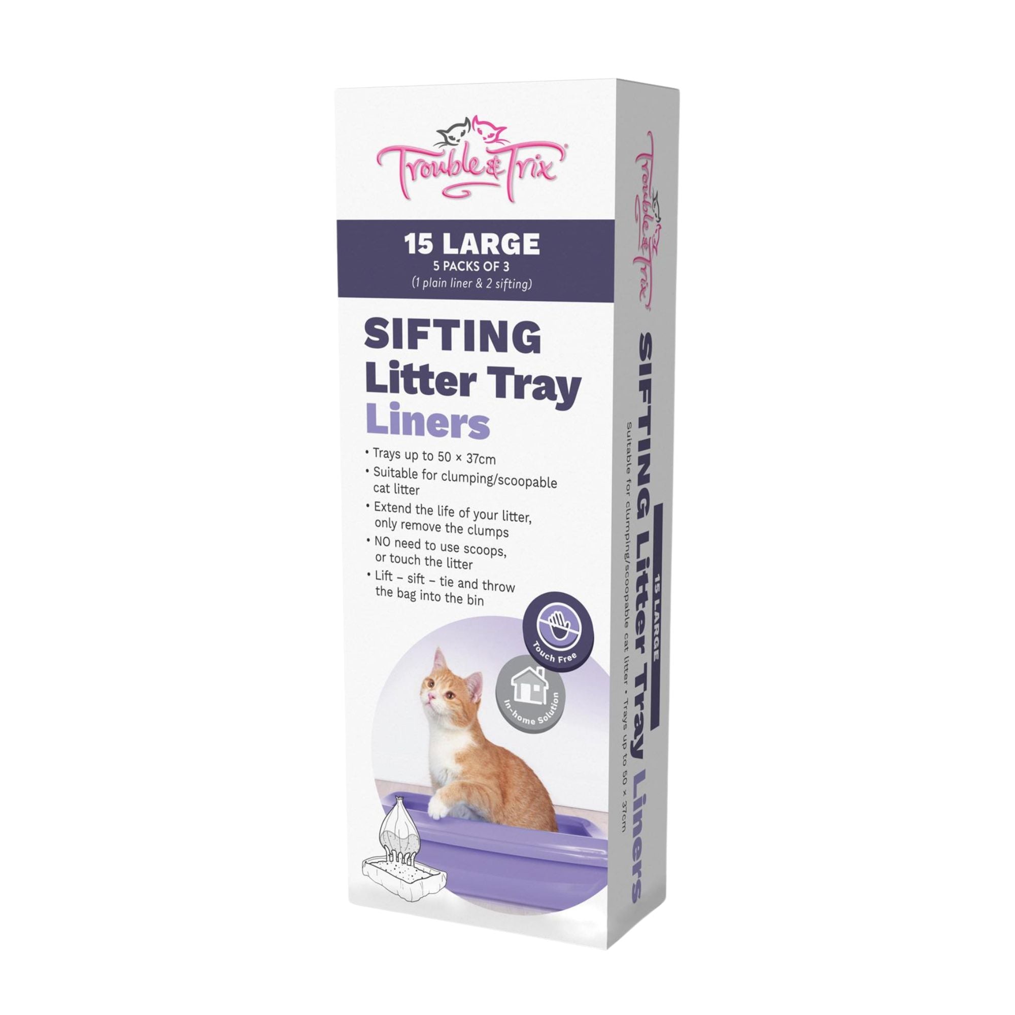 Trouble & Trix Easyclean Sifting Litter Tray Liners are easy-to-use. These litter tray liners help to quickly remove mess and clumps from your cat’s tray and maximise the use of standard litter, clumping litter, tofu litter and natural litter.