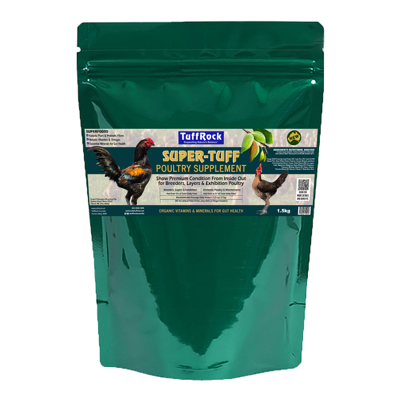 TuffRock Super-Tuff Poultry Supplement is a natural, organic vitamin and trace mineral blend designed to support gut health, feathering, egg production, fertility, and shell integrity in all poultry - from backyard layers to exhibition champions.