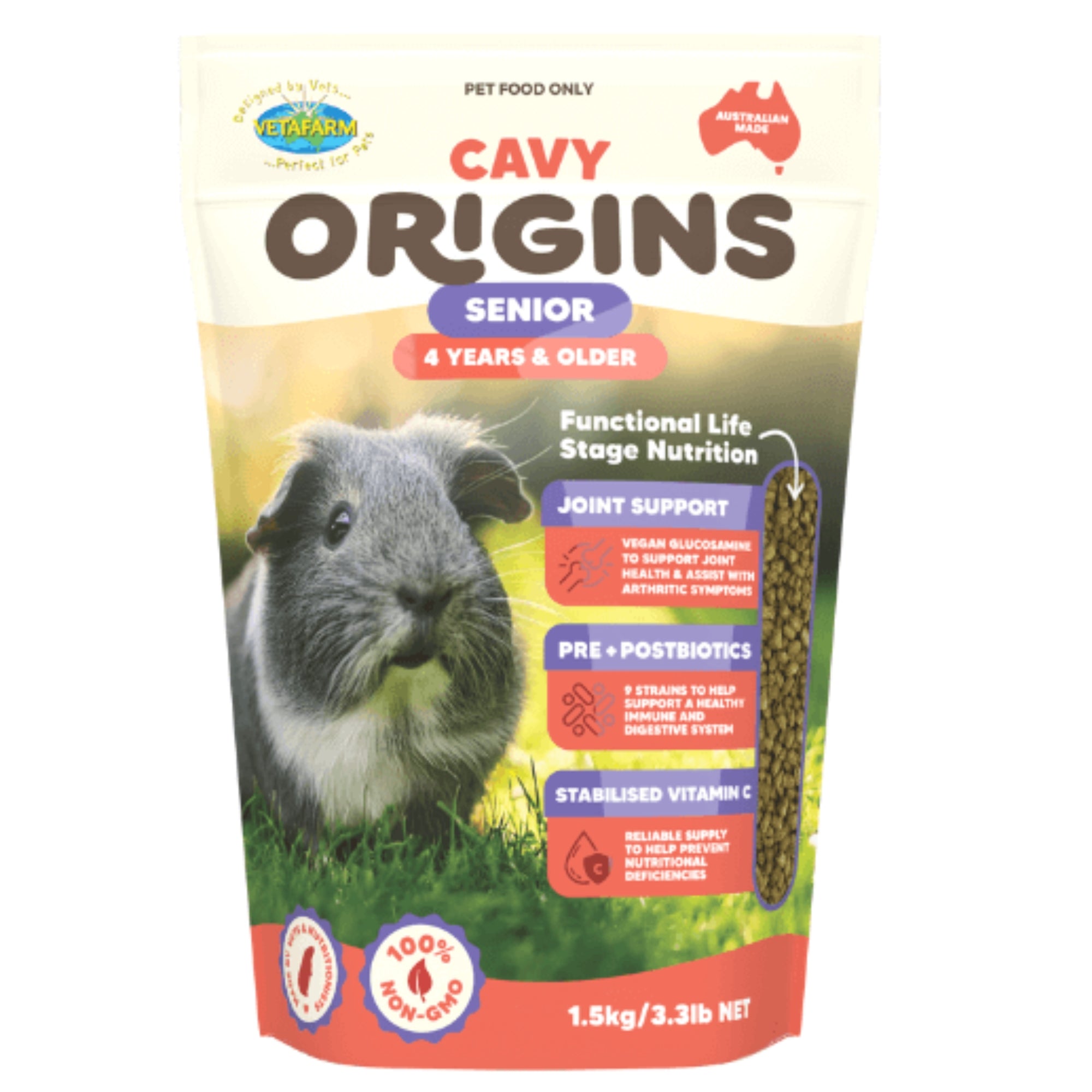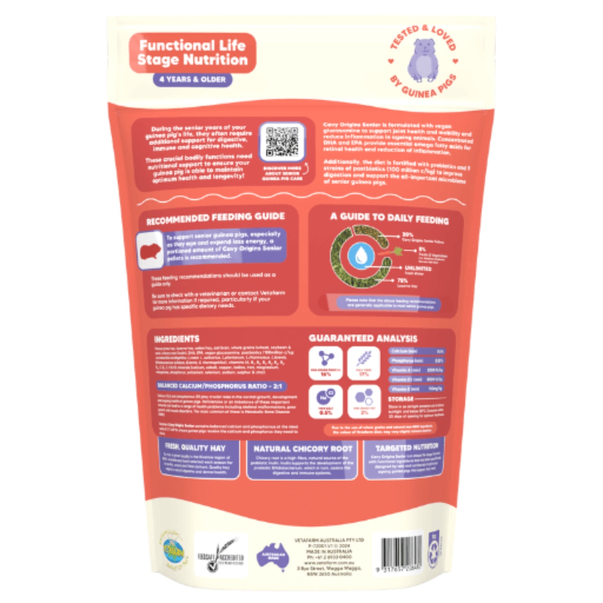 Origins Cavy Senior is specifically formulated to support ageing guinea pigs with functional ingredients like vegan glucosamine, postbiotics, Omega long chain fatty acids DHA + EPA, balanced vitamins, minerals, amino acids and increased fibre.