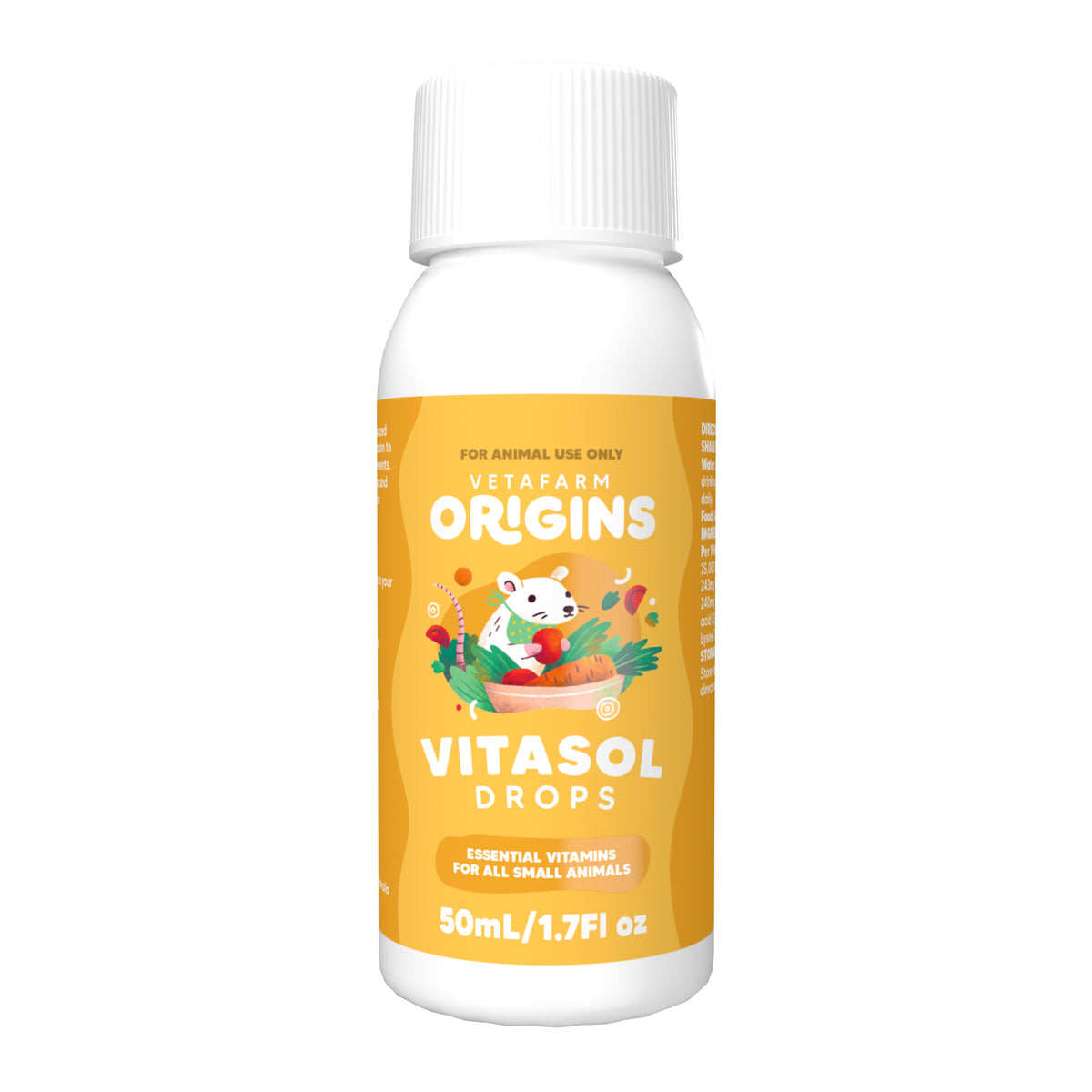 Vetafarm Origins Vitasol Drops are a highly concentrated source of vitamins formulated to supply small animals with essential vitamins.