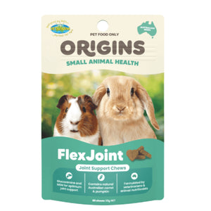 Vetafarm Origins FlexJoint Chews for small animals contains a combination of vegan glucosamine and MSM* (a naturally occurring supplement) that may assist with relief from debilitating arthritic symptoms in small herbivores (such as rabbits and guinea pigs).