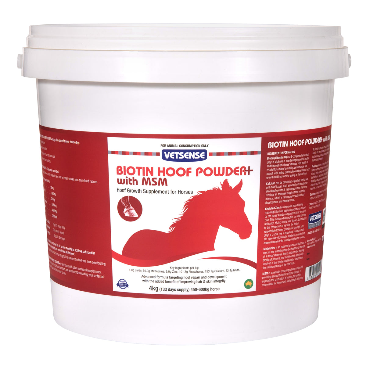 Vetsense Biotin Hoof Powder+ is safe to use with other nutritional supplements. For a horse with existing nutritional sensitivity, it is recommended consulting your preferred Veterinarian or Equine Nutritionist prior to use. Daily use should be continued for six to nine months to achieve substantial improvement in the quality and growth rate of the hoof. Once hoof has strengthened, continue using biotin to prevent the hoof wall from deteriorating.
