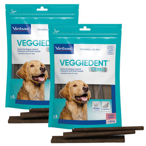 Generally, Veggiedent FR3SH Dental Chews for Dogs can be given once daily. Always talk with your veterinarian before making changes to your dog's dental health care.