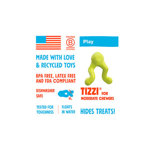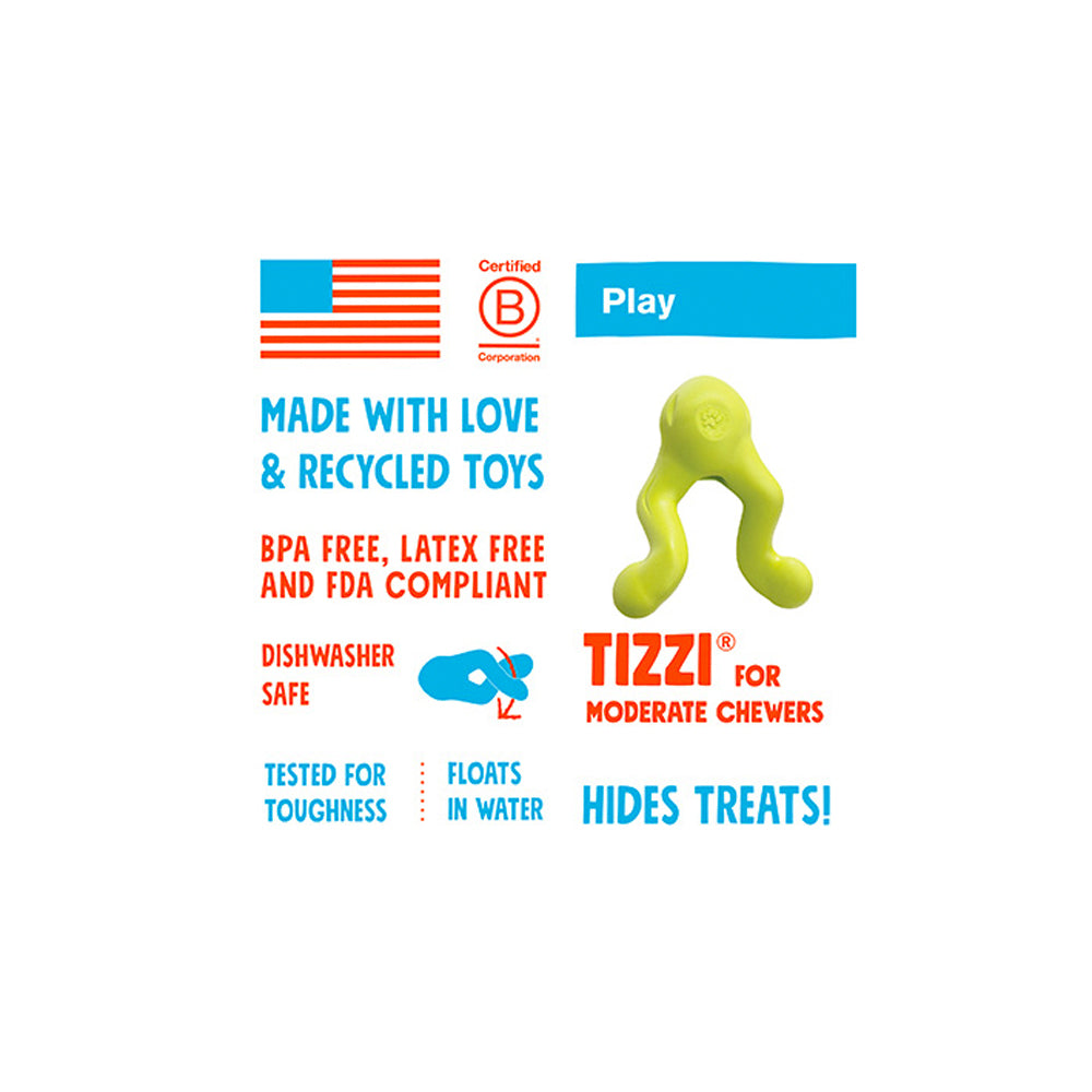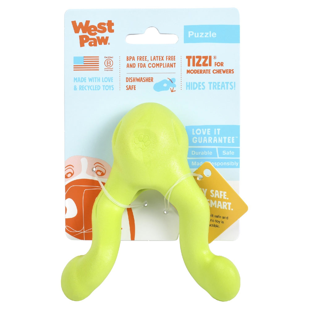 The West Paw Zogoflex Tizzi is a durable multi-use treat-dispensing & tug dog toy. Tizzi features a hidden treat compartment and flexible extensions that can be locked to throw the toy further.