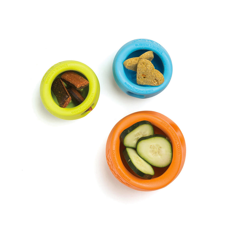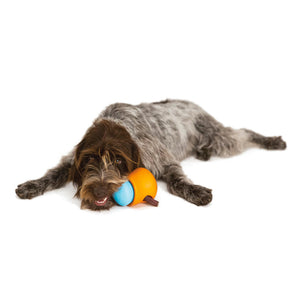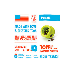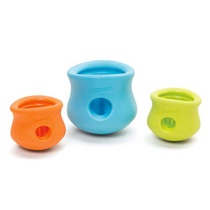 The West Paw Toppl is a durable and pliable treat-dispensing puzzle dog toy made from tough Zogoflex material. It features a wide top opening to add treats to the toy and nubs inside to hold treats.