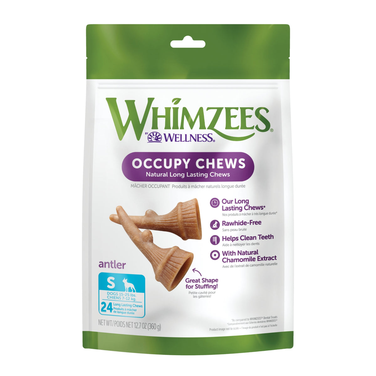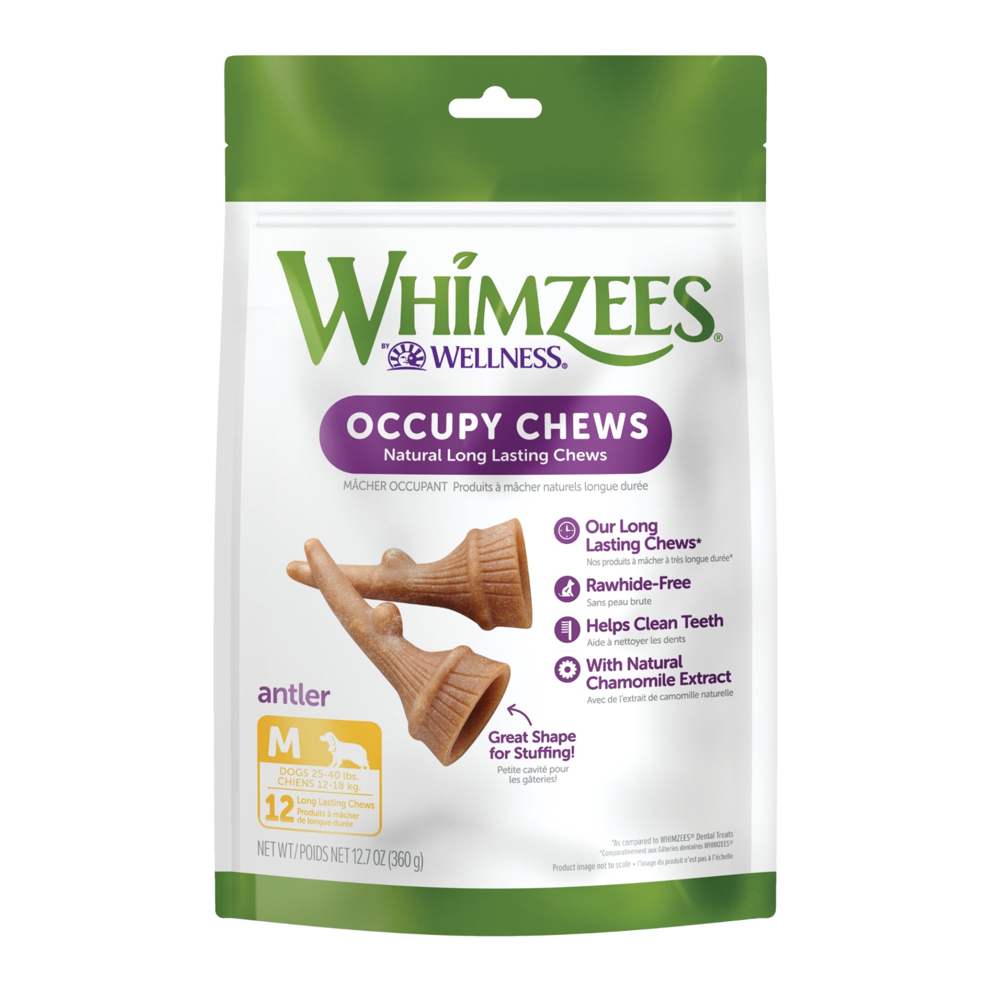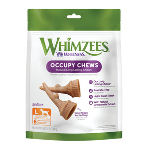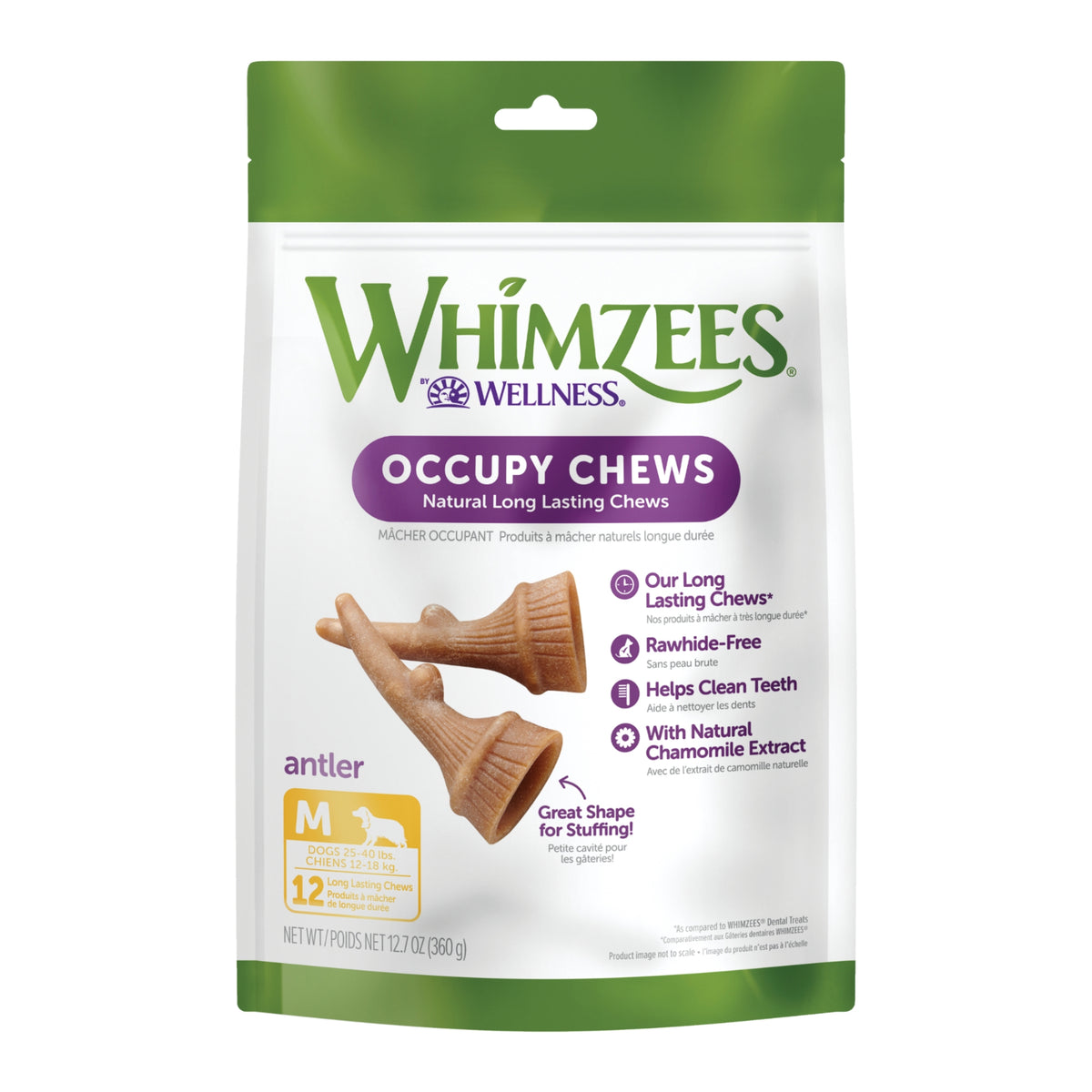 Whimzees Antlers Occupy Chews are specifically designed to keep your dog engaged longer. The unique antler shape was intentionally engineered to give your dog a healthy challenge that helps keeps them engaged and chewing longer. These great tasting chews are natural and rawhide-free for a fun & satisfying chewing experience!