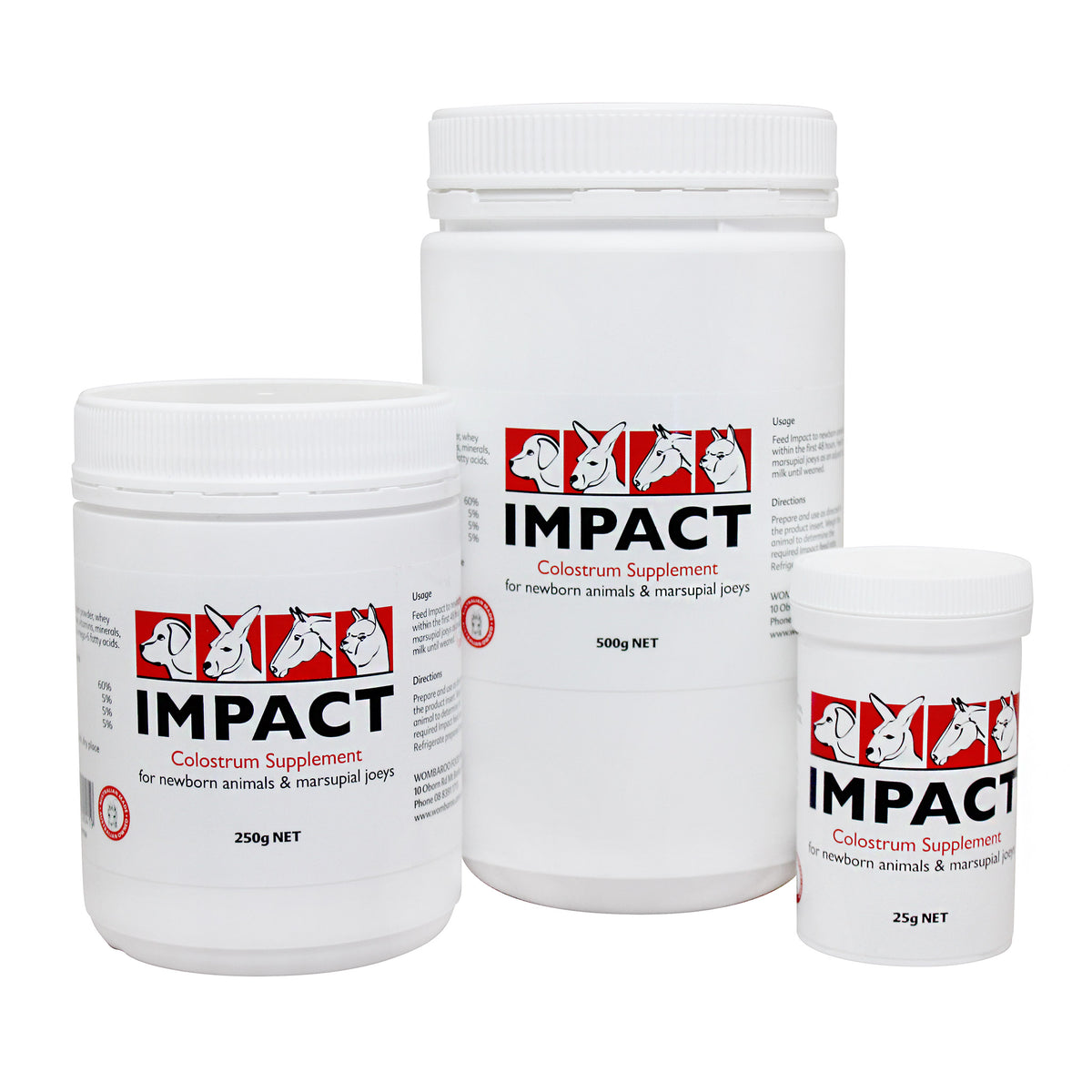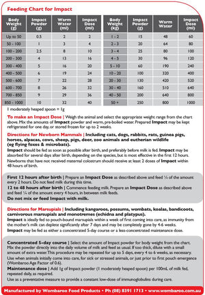 Impact should be fed as soon as possible after birth, and preferably before milk is fed. Impact can be absorbed for upto 48 hours after birth, depending on the species. Weigh the animal and select the appropriate weight range from the chart. Mix the amounts of Impact powder and warm pre-boiled water to make the daily Impact requirement. Refrigerate prepared Impact for one day only or store frozen in ice cube trays for up to 1 month.