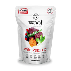WOOF Freeze Dried Wild Venison Treat is perfect for travel or as a treat.