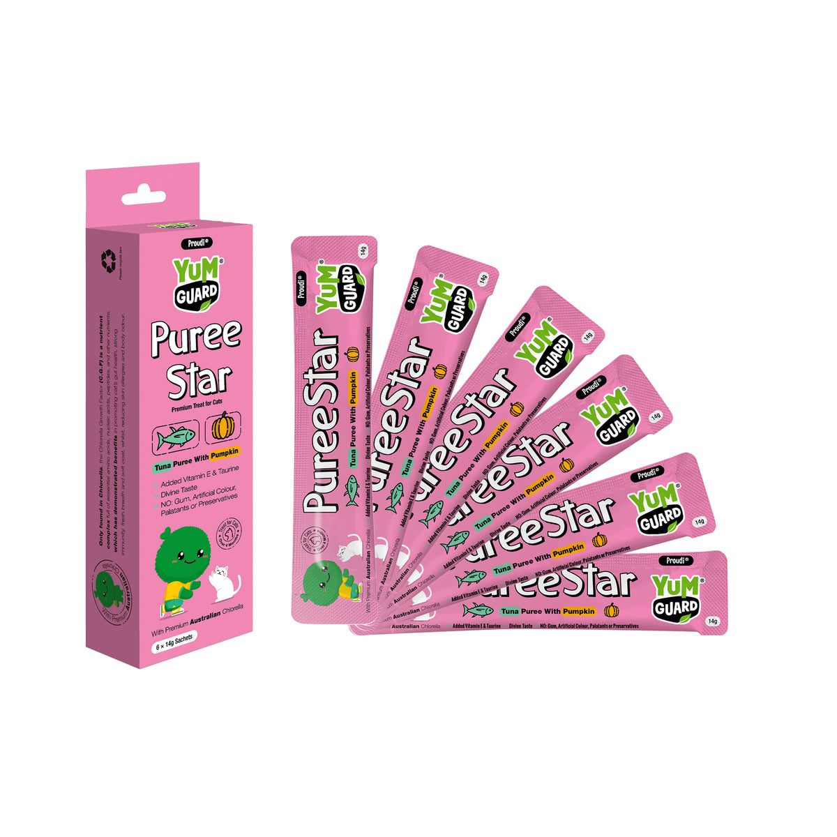 Give your cat a treat they'll love with YumGuard's Puree Star Tuna with Pumpkin - a nutritious snack packed with essential vitamins and minerals, including the renowned Chlorella growth factor for healthy tissue growth and repair.