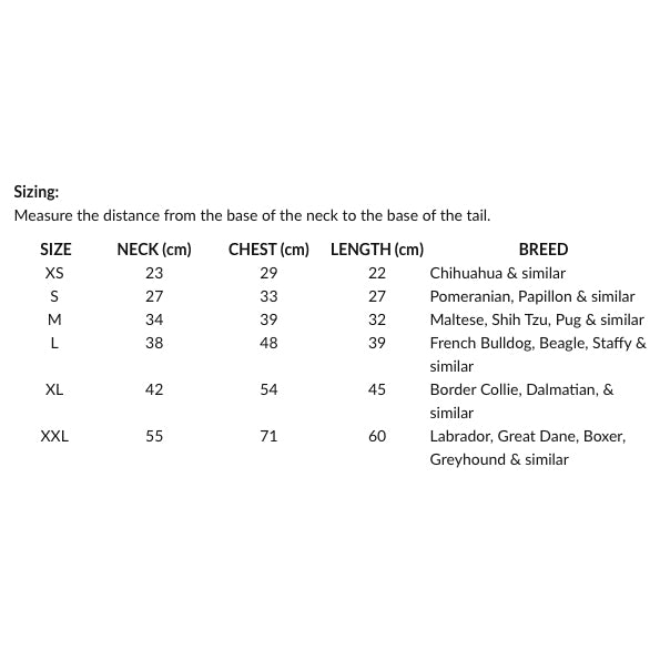 | Size | Neck (cm) | Chest (cm) | Length (cm) | Breed |